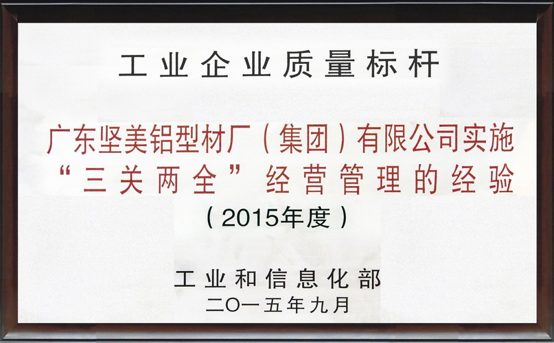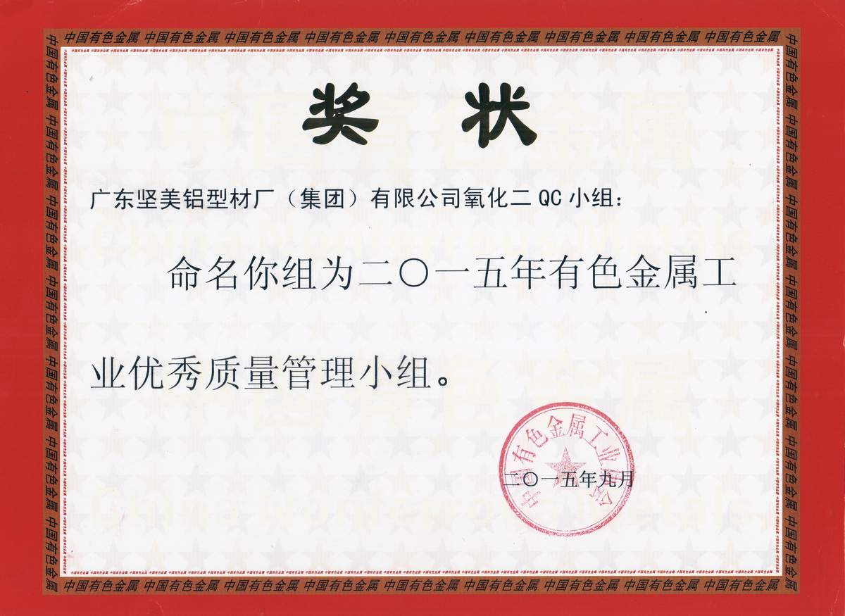• 2015年9月 有色金屬工業(yè)優(yōu)秀質(zhì)量管理小組獎狀:廣東堅美 (中國有色金屬工業(yè)協(xié)會)