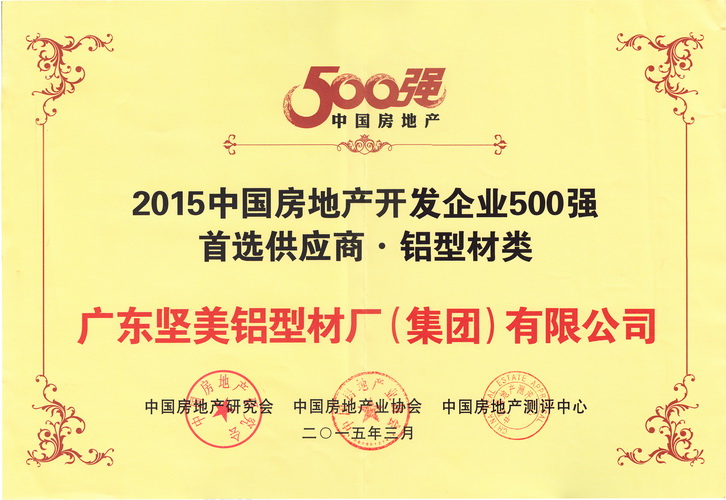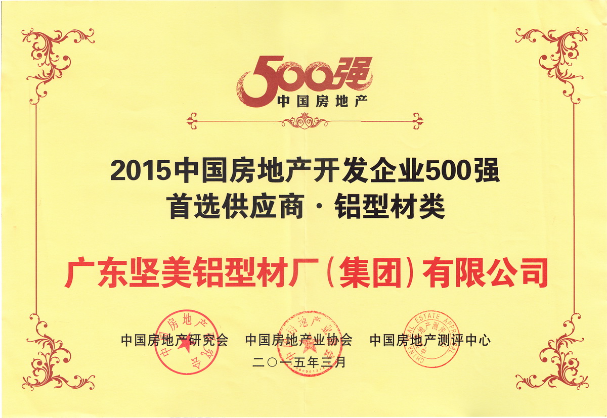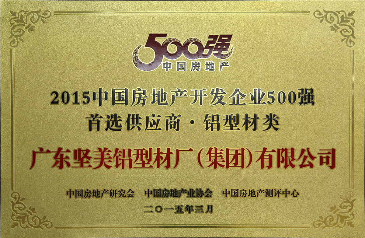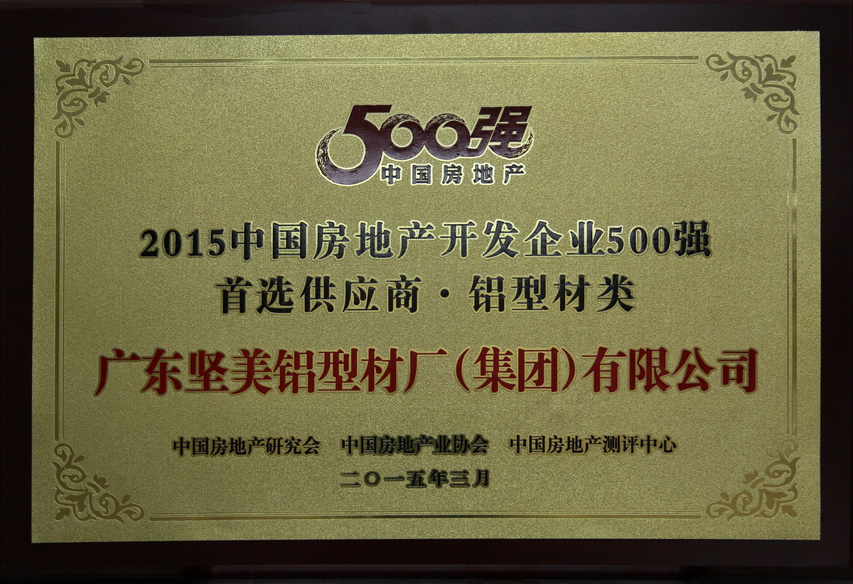 • 2015年3月 2015中國房地產(chǎn)開發(fā)企業(yè)500強首選供應(yīng)商鋁型材類牌匾:廣東堅美 (中國房地產(chǎn)業(yè)協(xié)會)
