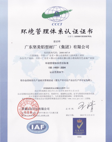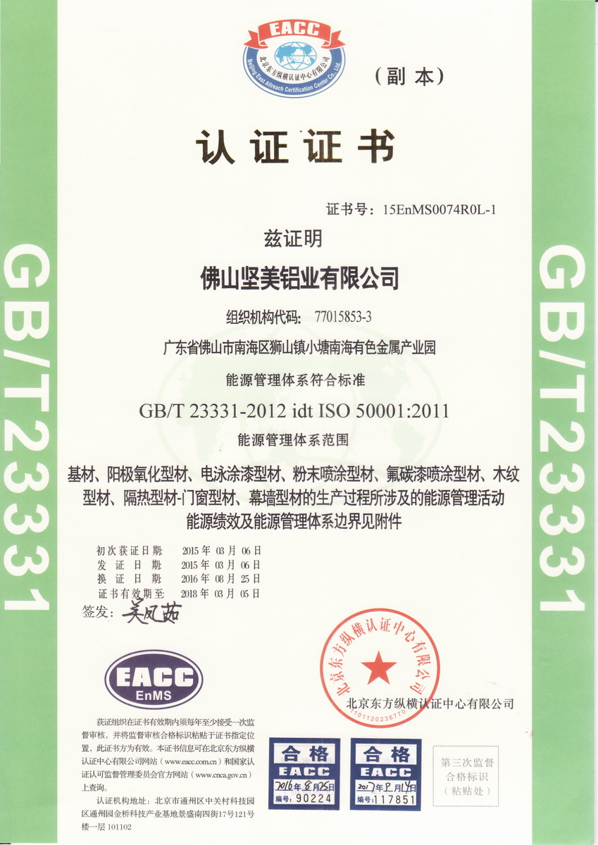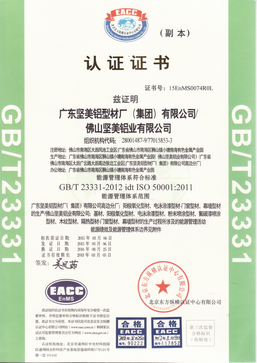 • 2015年3月 能源管理體系符合標準GB T 23331-2012 idt ISO 50001:2011:能源管理體系范圍:佛山堅美 (北京東方縱橫認證中心)