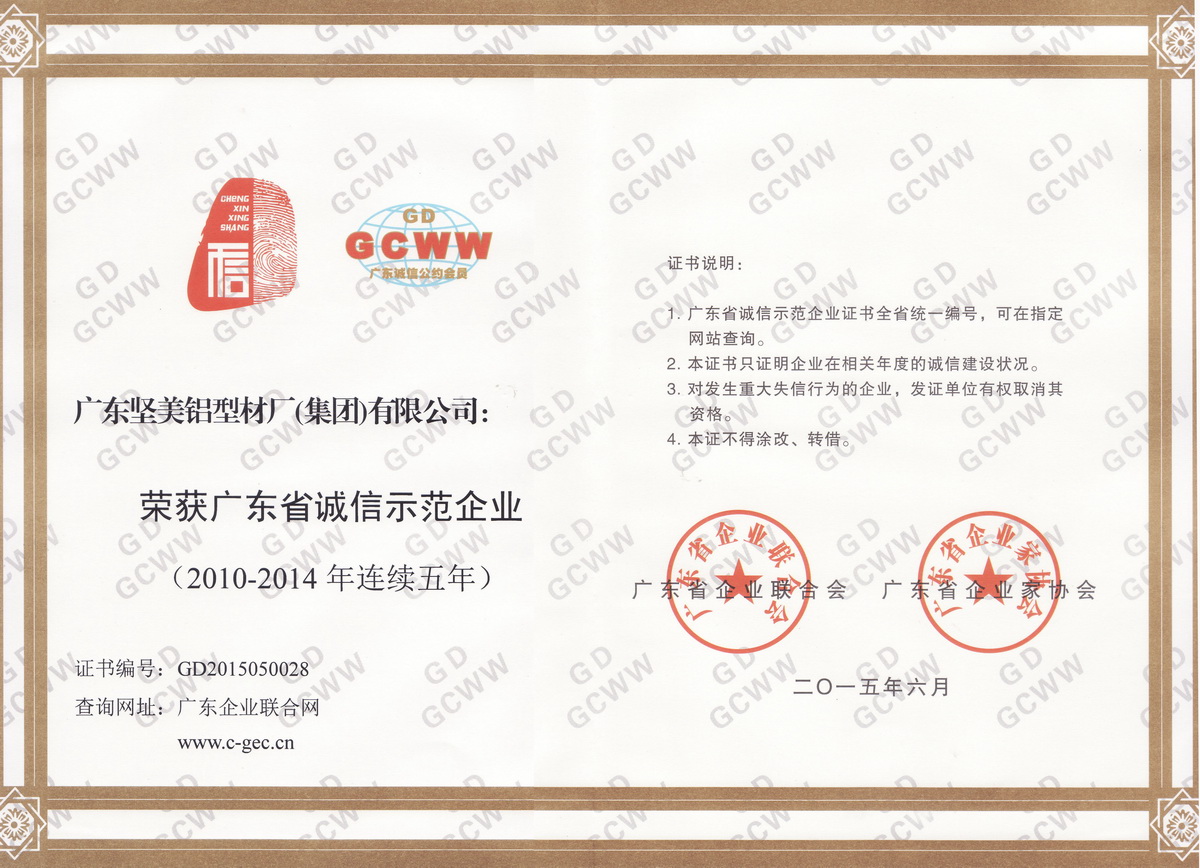 • 2015年6月 2010-2014連續(xù)五年廣東省誠信示范企業(yè):廣東堅美 (廣東省企業(yè)聯(lián)合會)