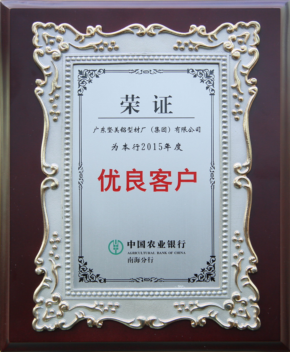 • 2015年 2015年度優(yōu)良客戶獎牌:廣東堅美 (中國農(nóng)業(yè)銀行南海分行)
