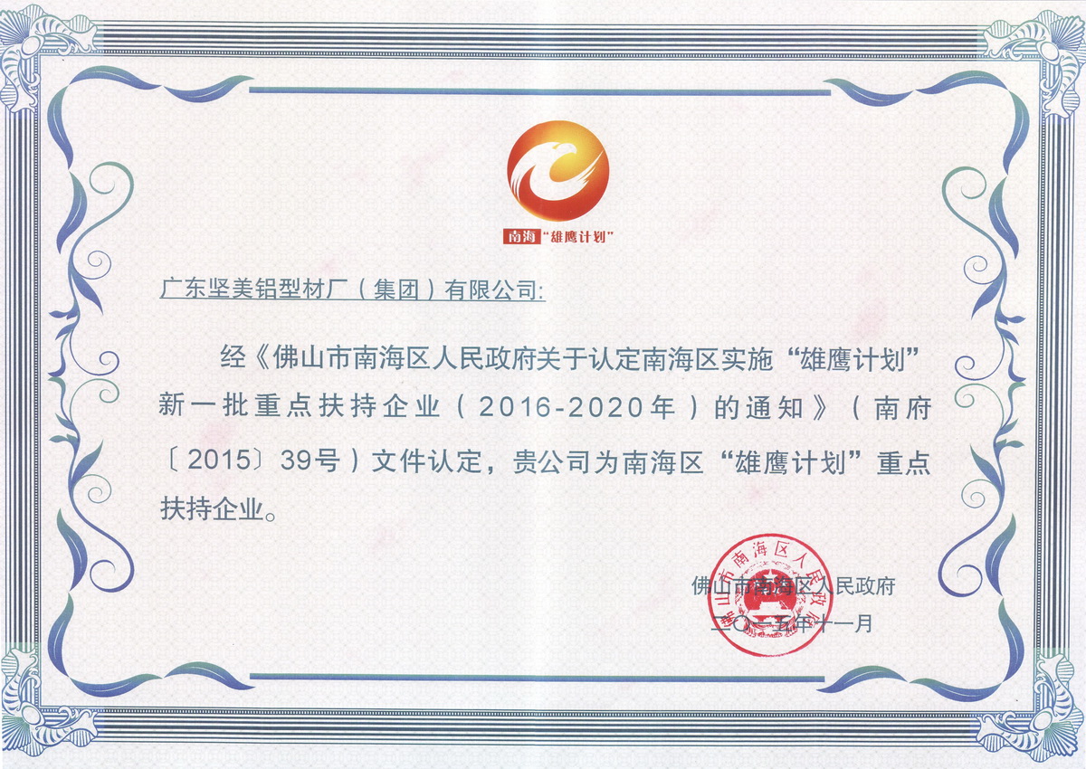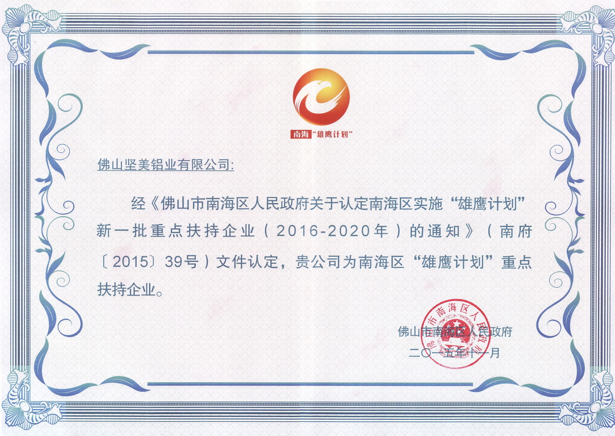 • 2015年11月 “雄鷹計劃”重點扶持企業(yè)證書:廣東堅美 (佛山市南海區(qū)人民政府)
