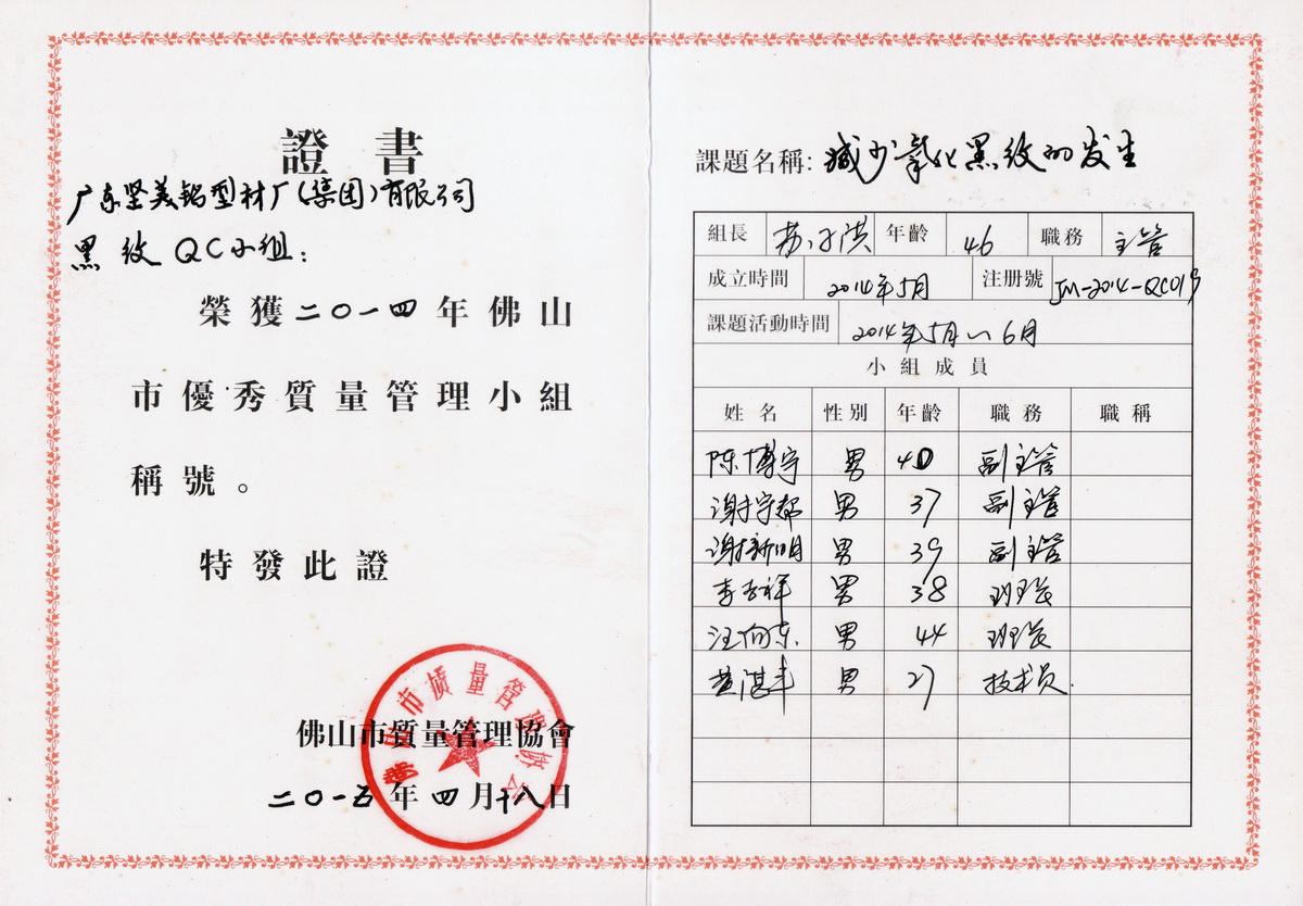 • 2015年4月 佛山市優(yōu)秀質(zhì)量管理小組榮譽證書 (佛山市質(zhì)量管理協(xié)會)