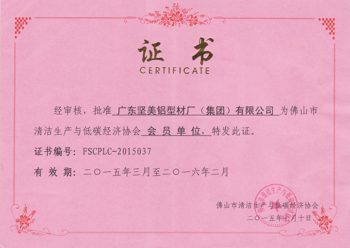 • 2015年7月 佛山市清潔生產(chǎn)與低碳經(jīng)濟協(xié)會會員單位證書:廣東堅美 (佛山市清潔生產(chǎn)與低碳經(jīng)濟協(xié)會)
