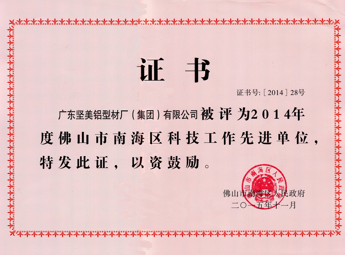 • 2015年11月 2014年度佛山市南海區(qū)科技工作先進單位 :廣東堅美 (佛山市南海區(qū)人民政府)
