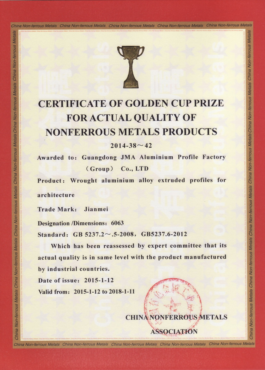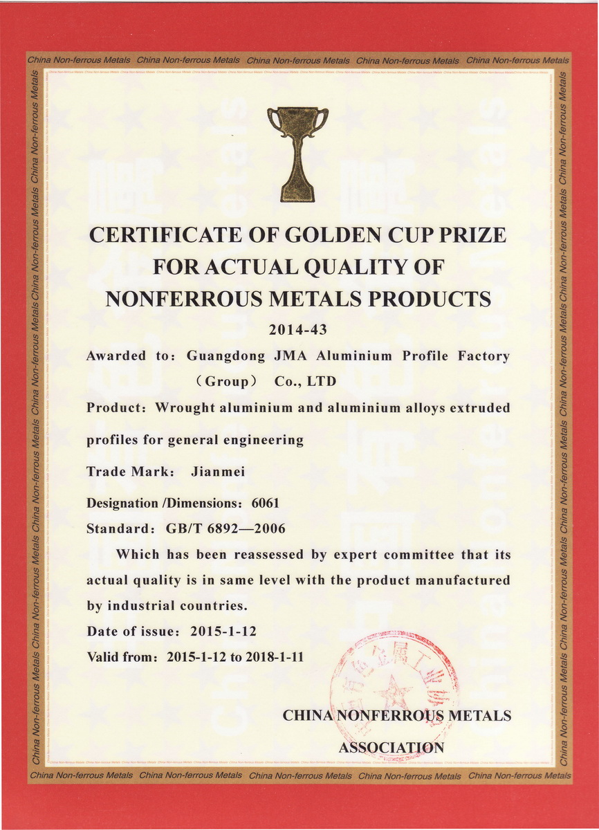 • 2015年1月 有色金屬產(chǎn)品實物質(zhì)量金杯獎證書2011-43:一般工業(yè)鋁及鋁合金擠壓型材:廣東堅美 (中國有色金屬工業(yè)協(xié)會)英文版