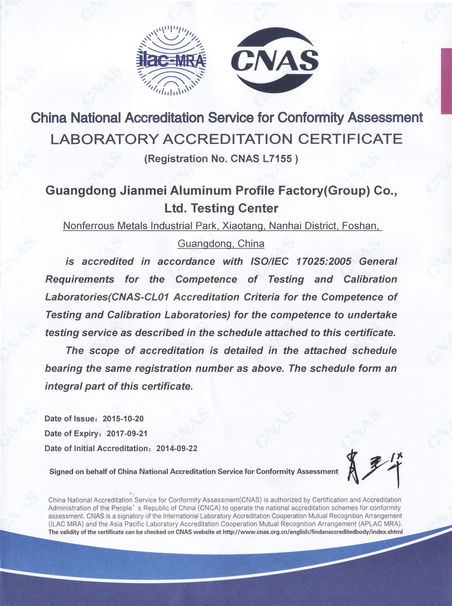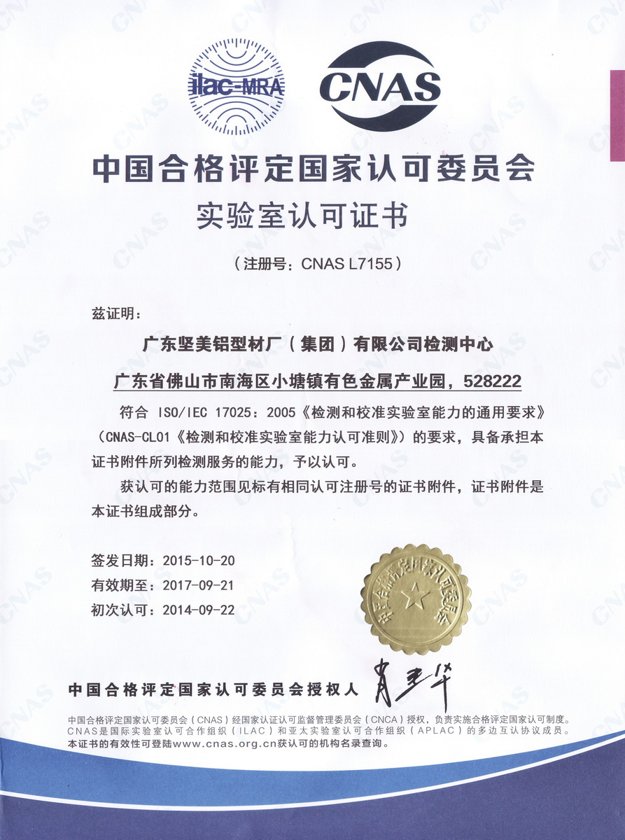 • 2015年10月實驗室認可證書:廣東堅美 (中國合格評定國家認可委員會)