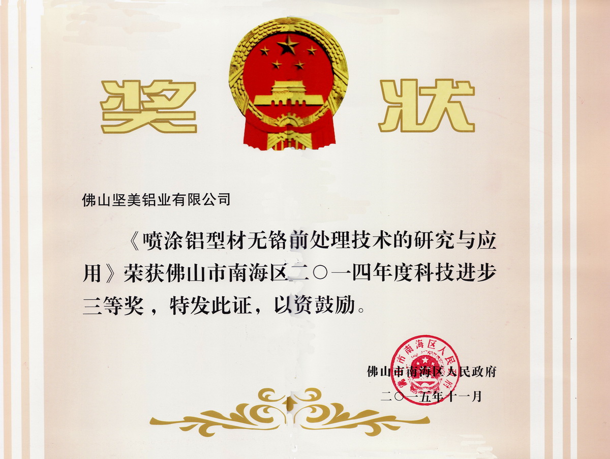 • 2015年11月 南海區(qū)2014年度科技進步三等獎:噴涂鋁型材無鉻前處理技術(shù)的研究與應(yīng)用:佛山堅美 (佛山市南海區(qū)人民政府)