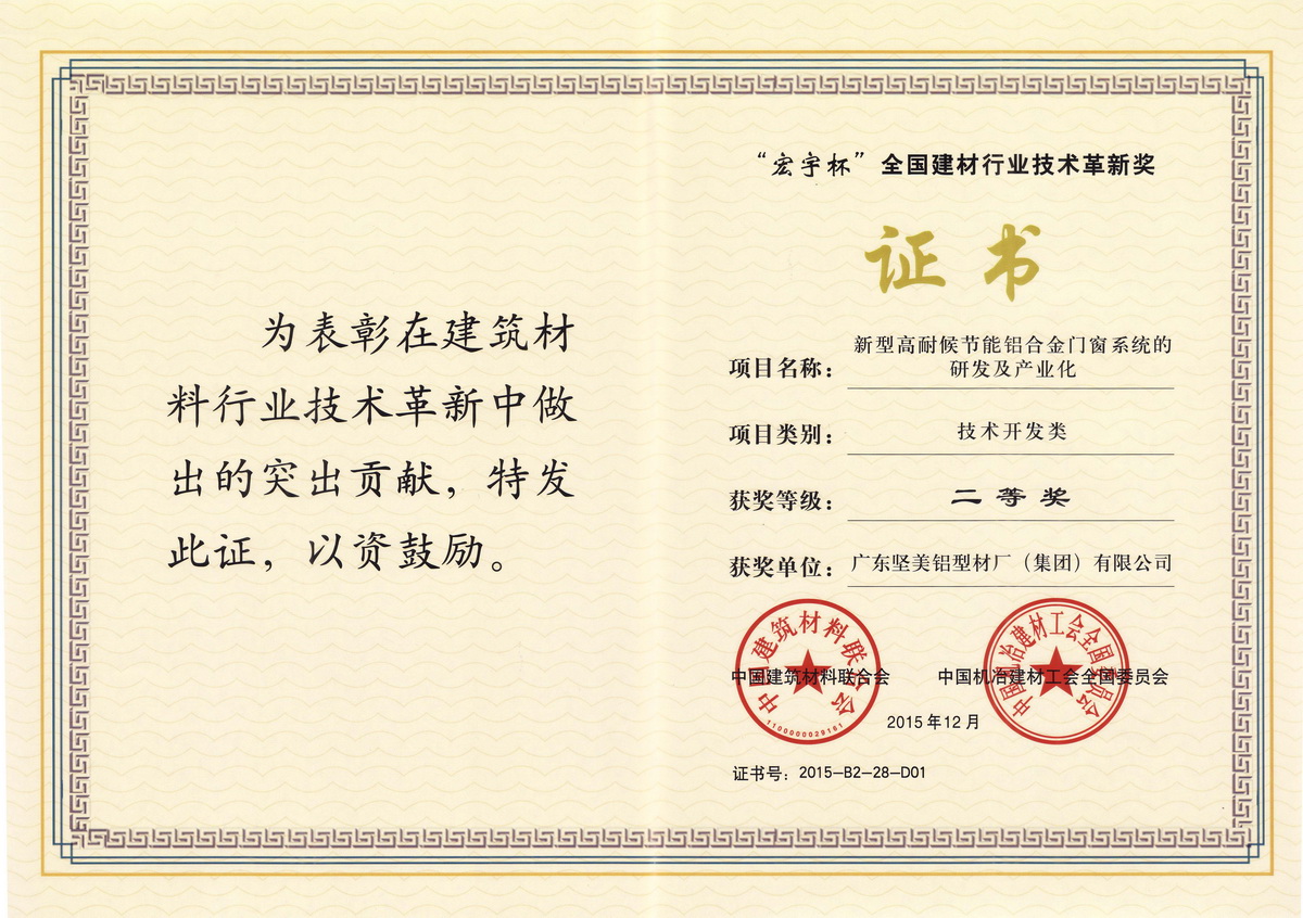 • 2015年12月 “宏宇杯“全國建材行業(yè)技術(shù)革新獎二等獎:新型高耐候節(jié)能鋁合金門窗系統(tǒng)的研發(fā)及產(chǎn)業(yè)化:廣東堅美 (中國建筑材料聯(lián)合會)