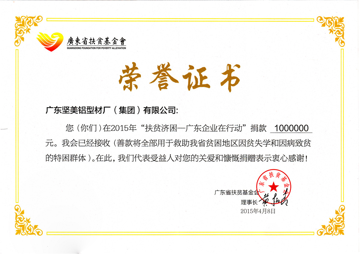 • 2015年”扶貧濟困廣東企業(yè)在行動“榮譽證書