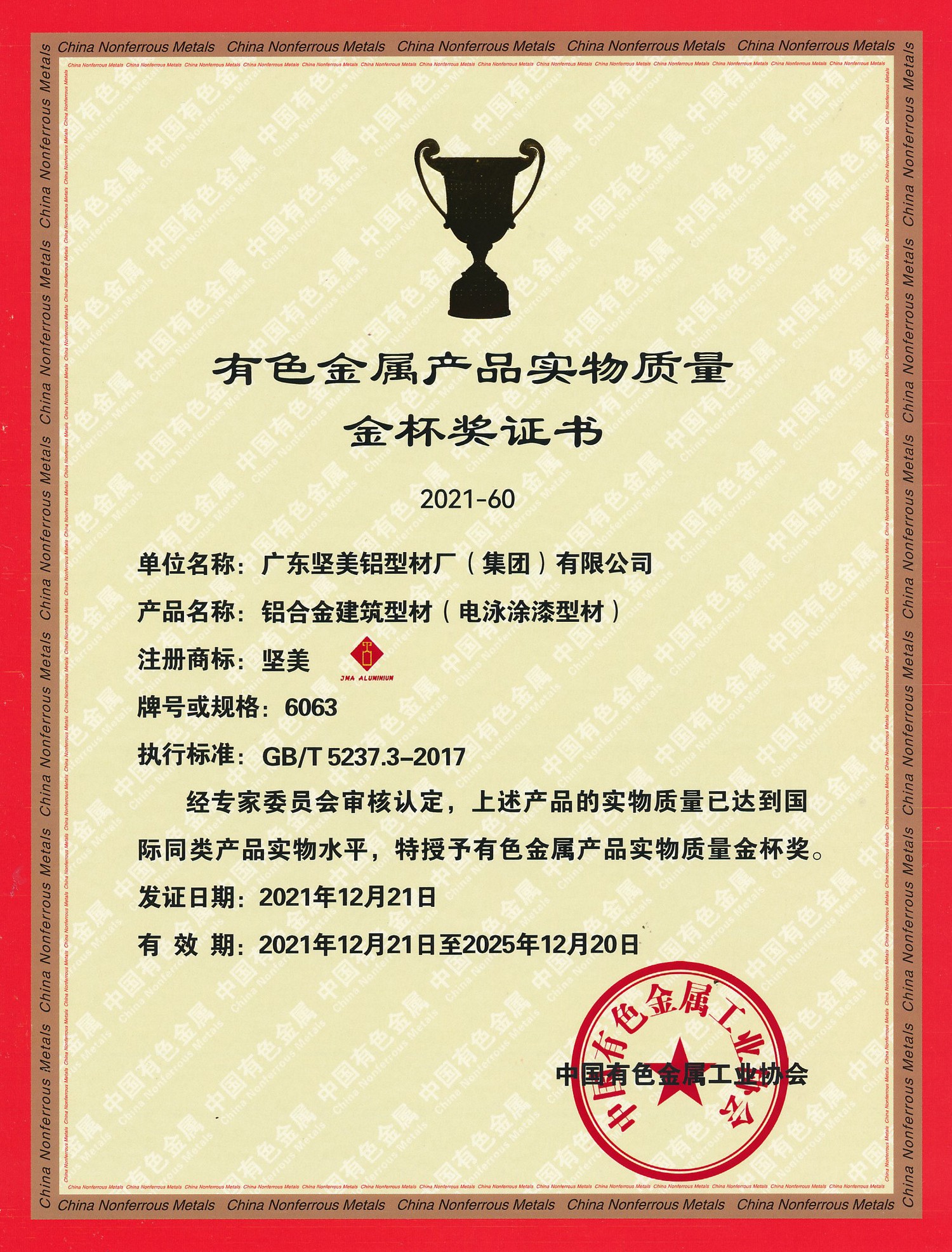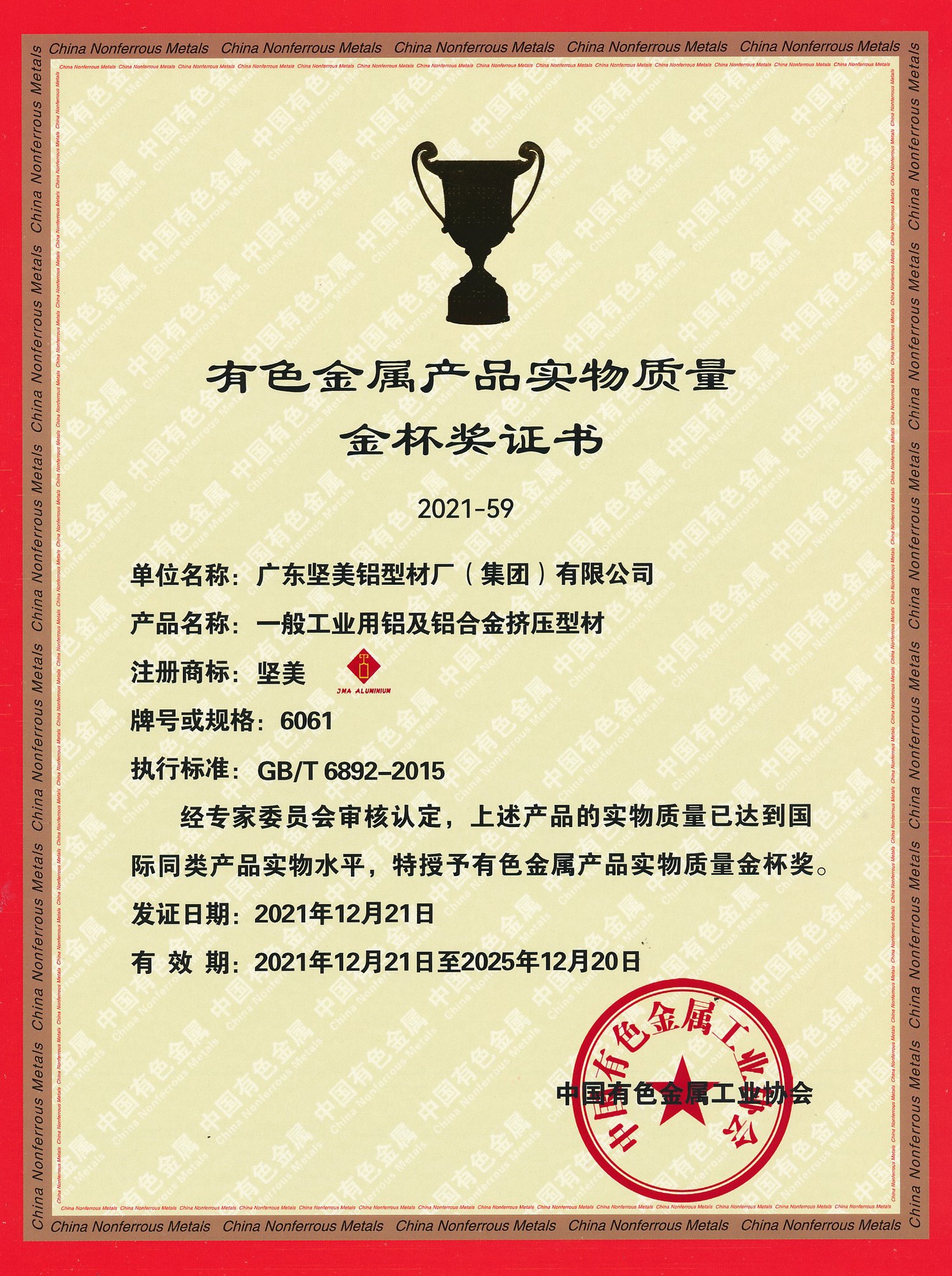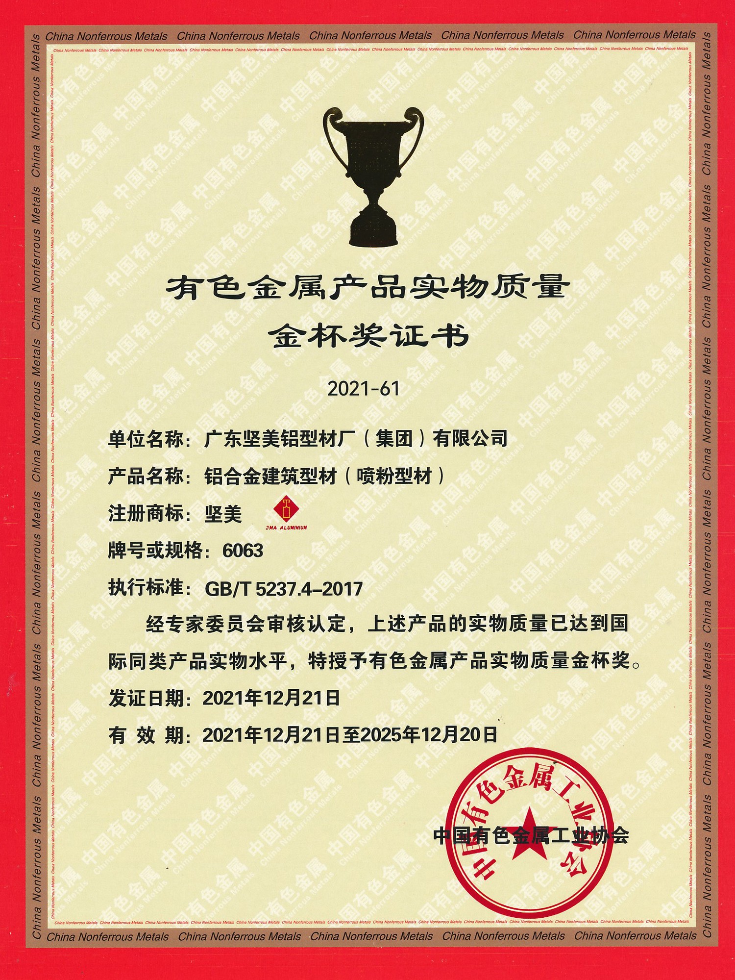 2021年金杯獎證書 一般工業(yè)用鋁及鋁合金擠壓型材 中文(中國有色金屬工業(yè)協(xié)會)