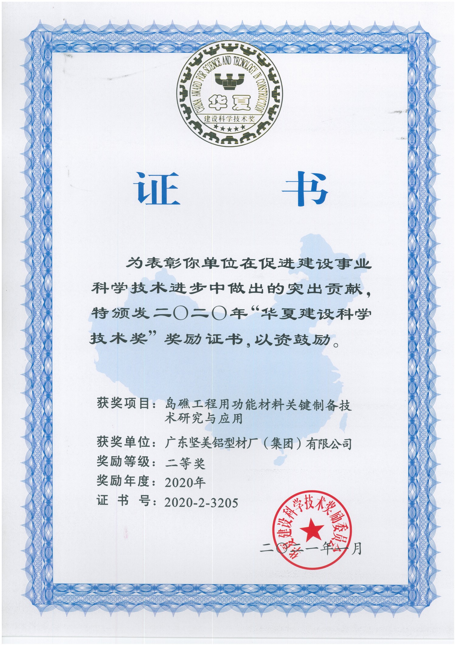 2021年1月 2020年華夏建設(shè)科學(xué)技術(shù)獎(二等獎):島礁工程用功能材料關(guān)鍵制備技術(shù)研究與應(yīng)用:廣東堅美(華夏建設(shè)科學(xué)技術(shù)獎勵委員會)