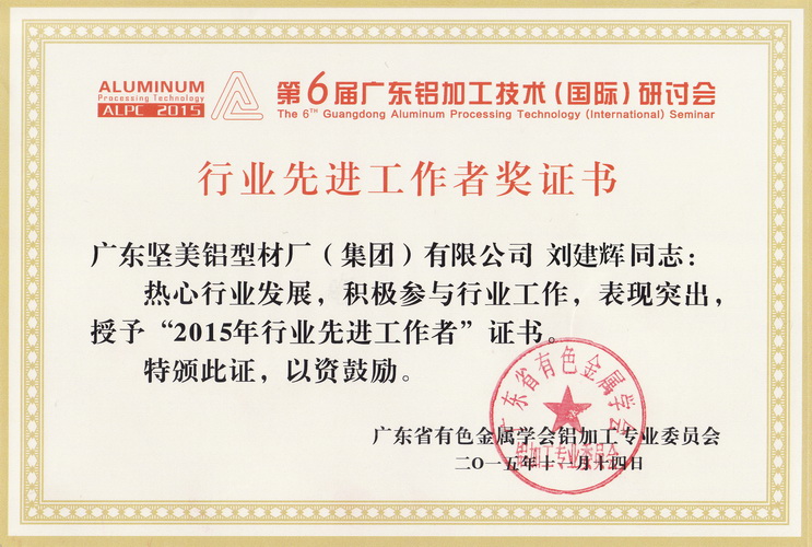 • 2016年10月 南海區(qū)2015年度科技進(jìn)步獎(jiǎng)一等獎(jiǎng):消光半透明電泳鋁型材的研發(fā)及其國(guó)際標(biāo)準(zhǔn)化