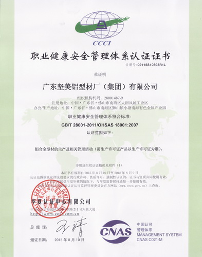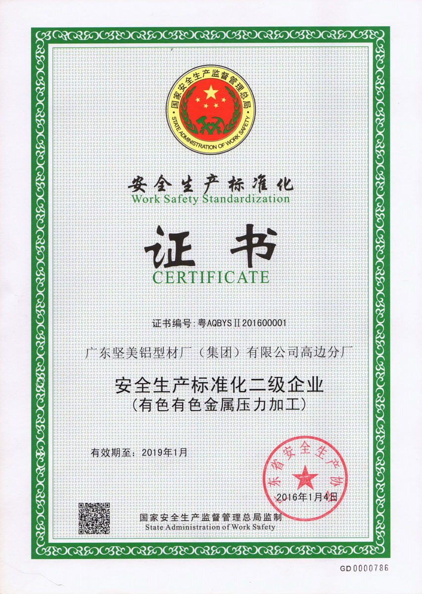 • 2016年1月 安全生產(chǎn)標(biāo)準(zhǔn)化二級(jí)企業(yè)2(有色金屬壓力加工):廣東堅(jiān)美 (廣東省安全生產(chǎn)協(xié)會(huì))