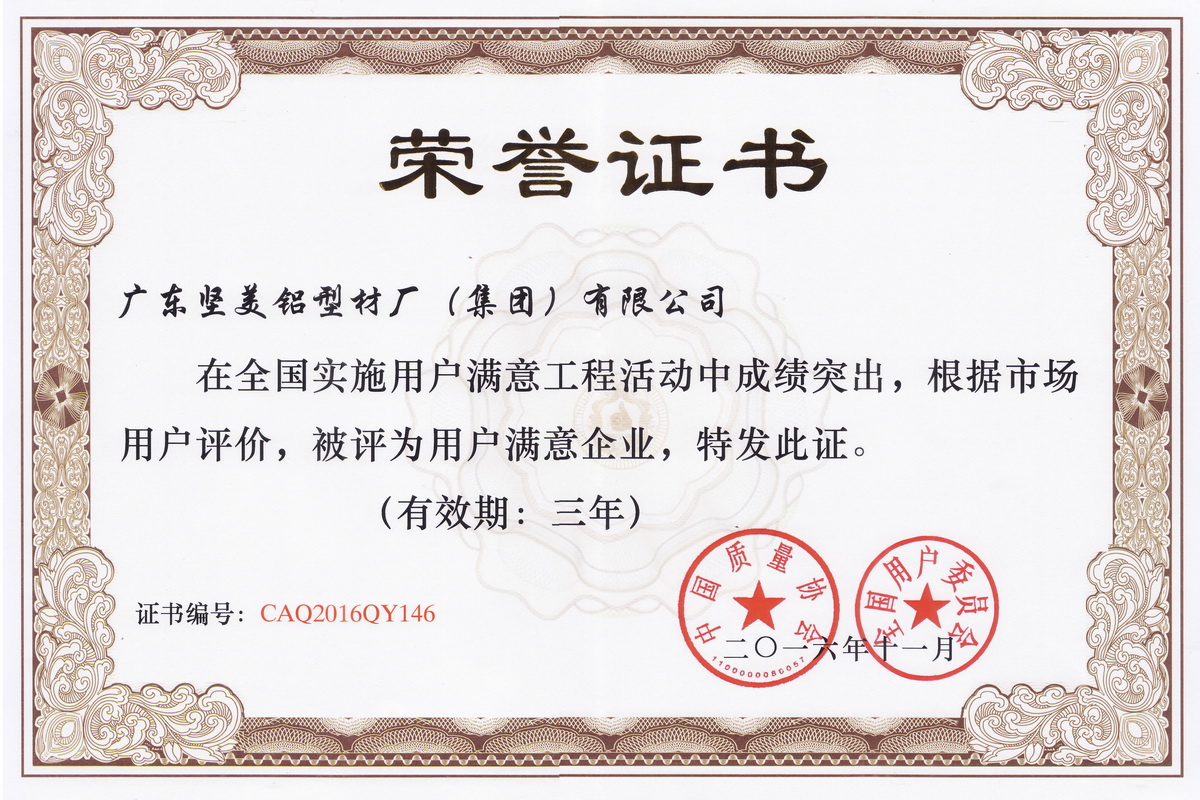• 2016年 11月 用戶(hù)滿(mǎn)意企業(yè):廣東堅(jiān)美(中國(guó)質(zhì)量協(xié)會(huì))
