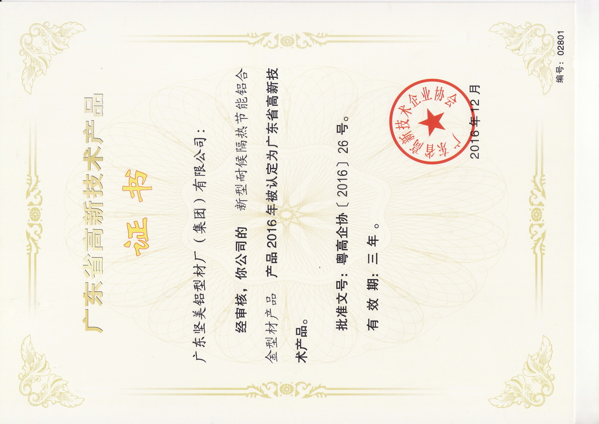 • 2016年12月 2016年度廣東省高新技術(shù)產(chǎn)品證書(shū) :新型耐候隔熱節(jié)能鋁合金型材產(chǎn)品(廣東省高新技術(shù)企業(yè)協(xié)會(huì))