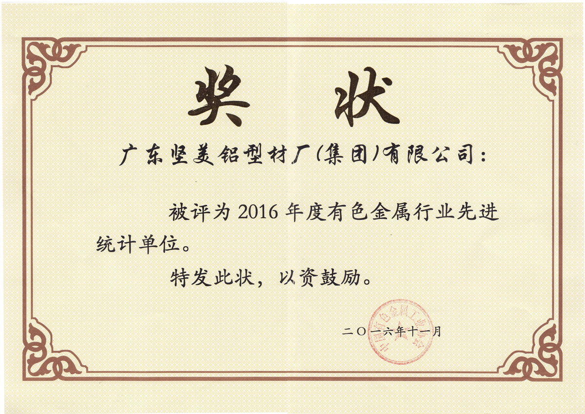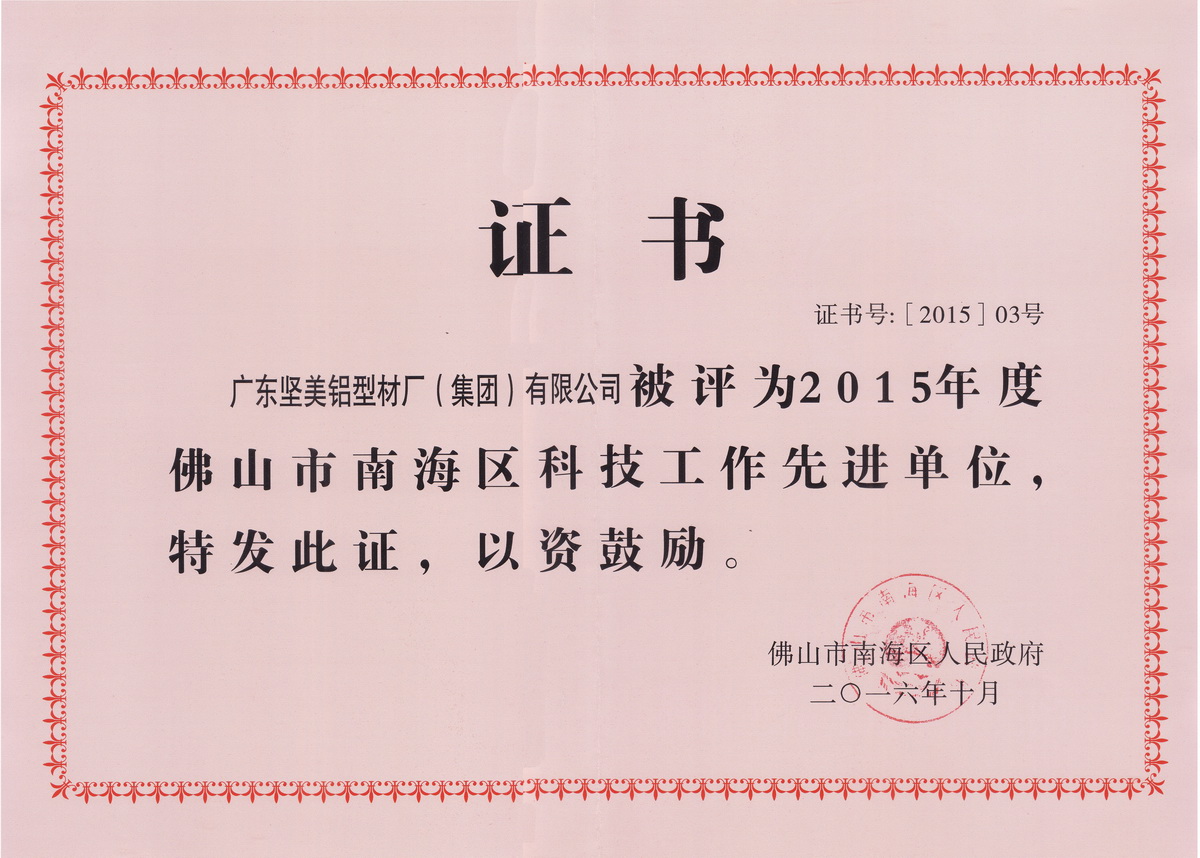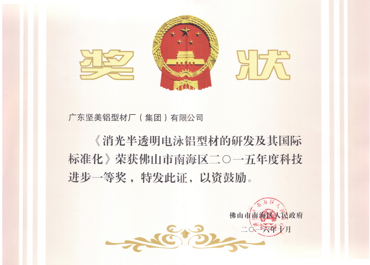 • 2016年10月 2015年度南海區(qū)科技進(jìn)步獎(jiǎng)一等獎(jiǎng) 消光半透明電泳鋁型材的研發(fā)及其國(guó)際標(biāo)準(zhǔn)化:廣東堅(jiān)美