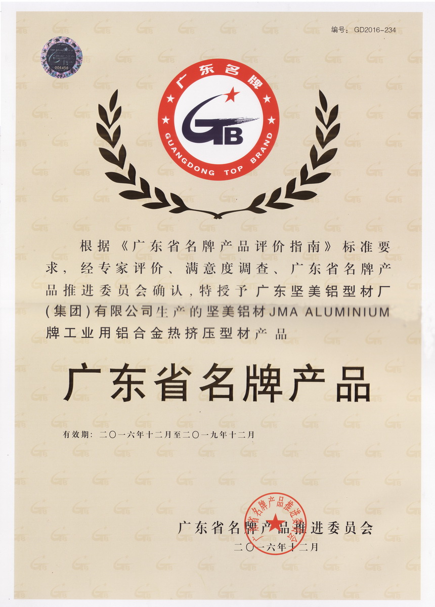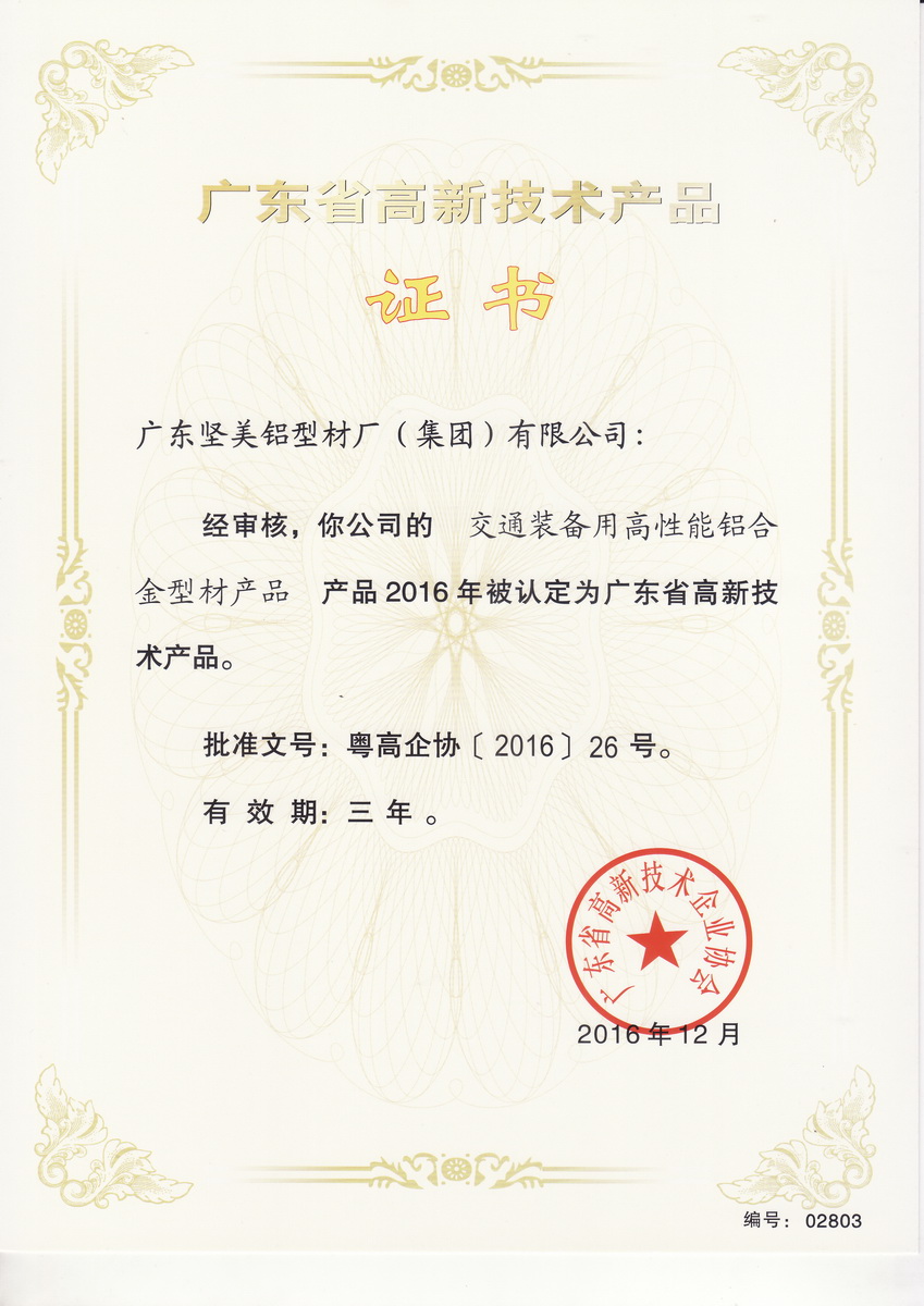 • 2016年12月 2016年度廣東省高新技術(shù)產(chǎn)品證書(shū) :交通裝備用高性能鋁合金型材產(chǎn)品(廣東省高新技術(shù)企業(yè)協(xié)會(huì))