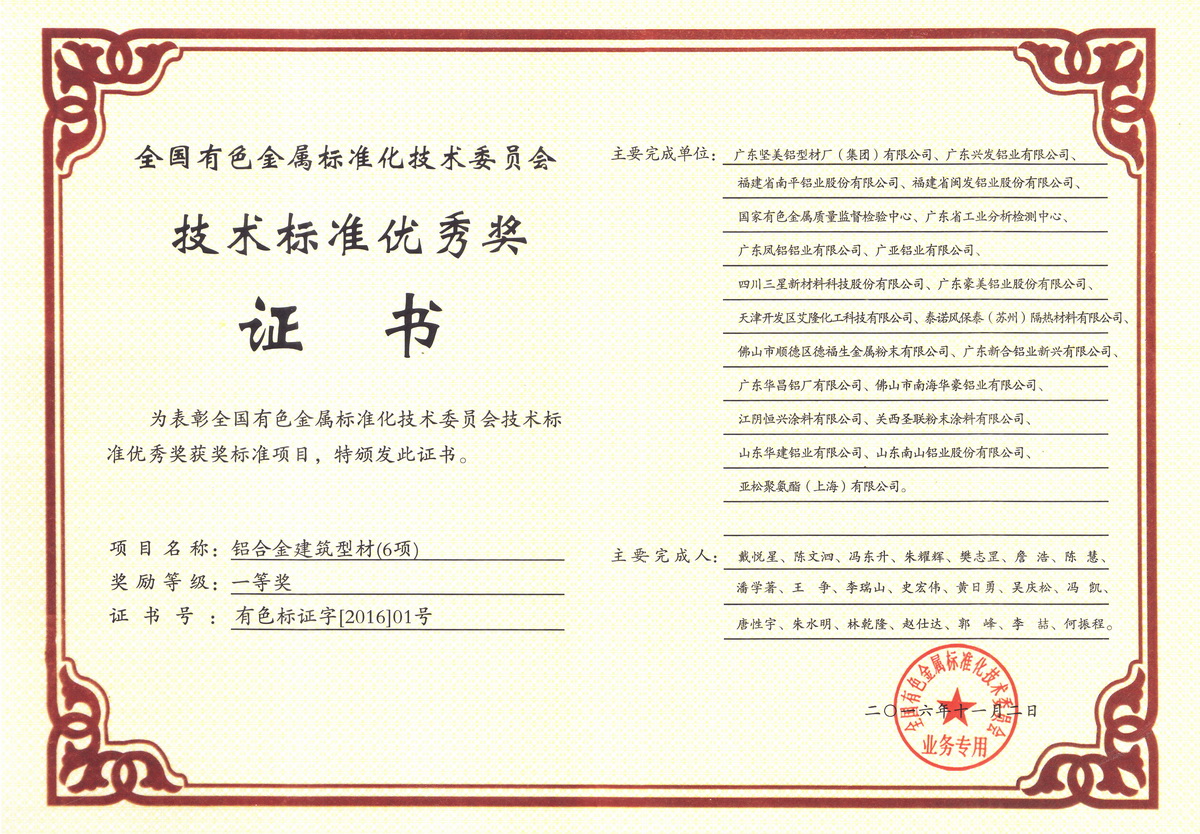 • 2016.11 全國(guó)有色金屬技術(shù)標(biāo)準(zhǔn)優(yōu)秀獎(jiǎng)(鋁合金建筑型材6項(xiàng) 一等獎(jiǎng))