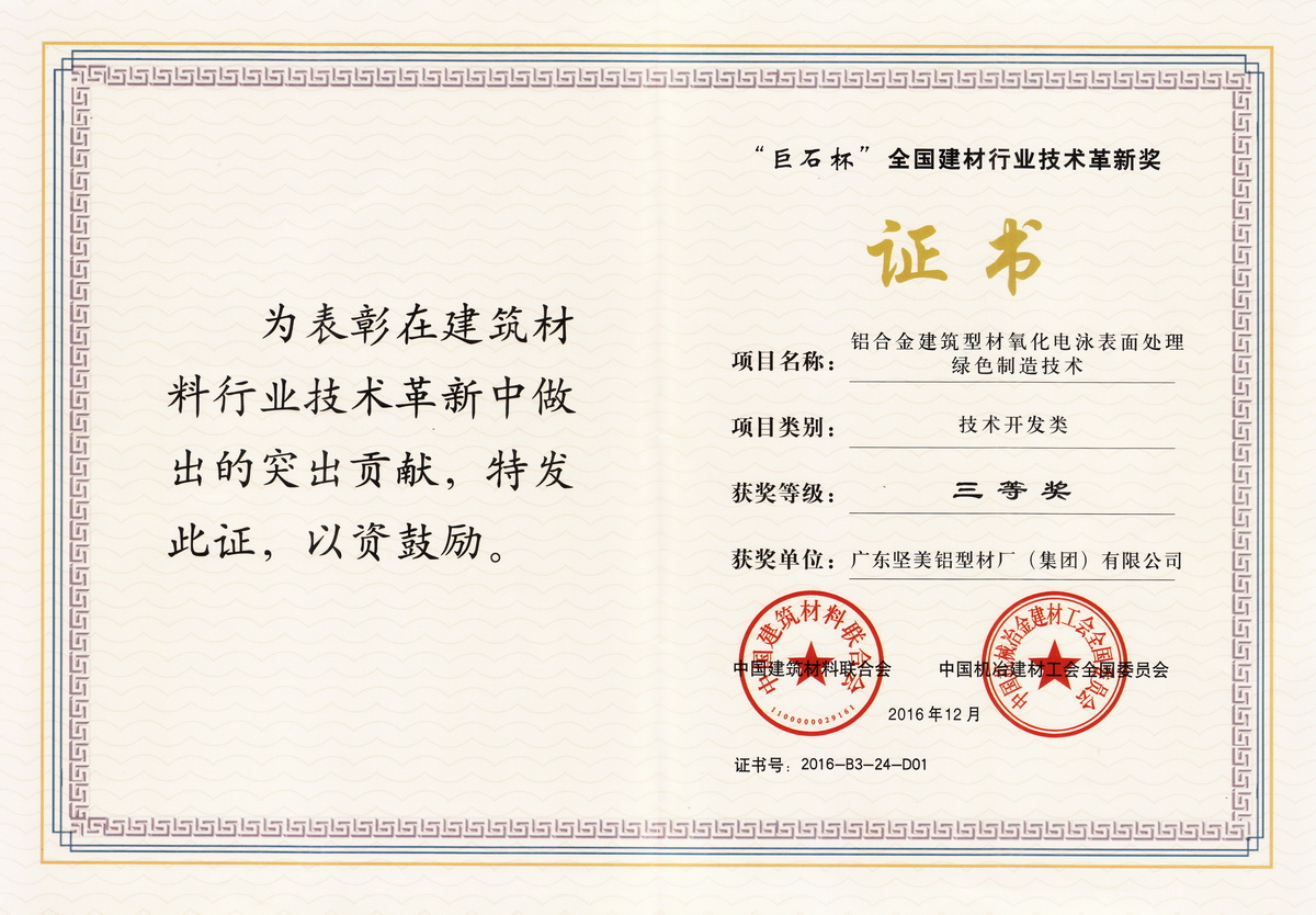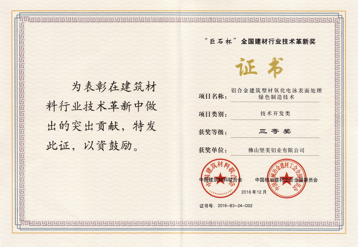 • 2016年12月 2016年度“巨石杯”全國(guó)建材行業(yè)技術(shù)革新獎(jiǎng)三等獎(jiǎng)-鋁合金建筑型材氧化電泳表面處理綠色制造技術(shù):廣東堅(jiān)美公司證書(shū)