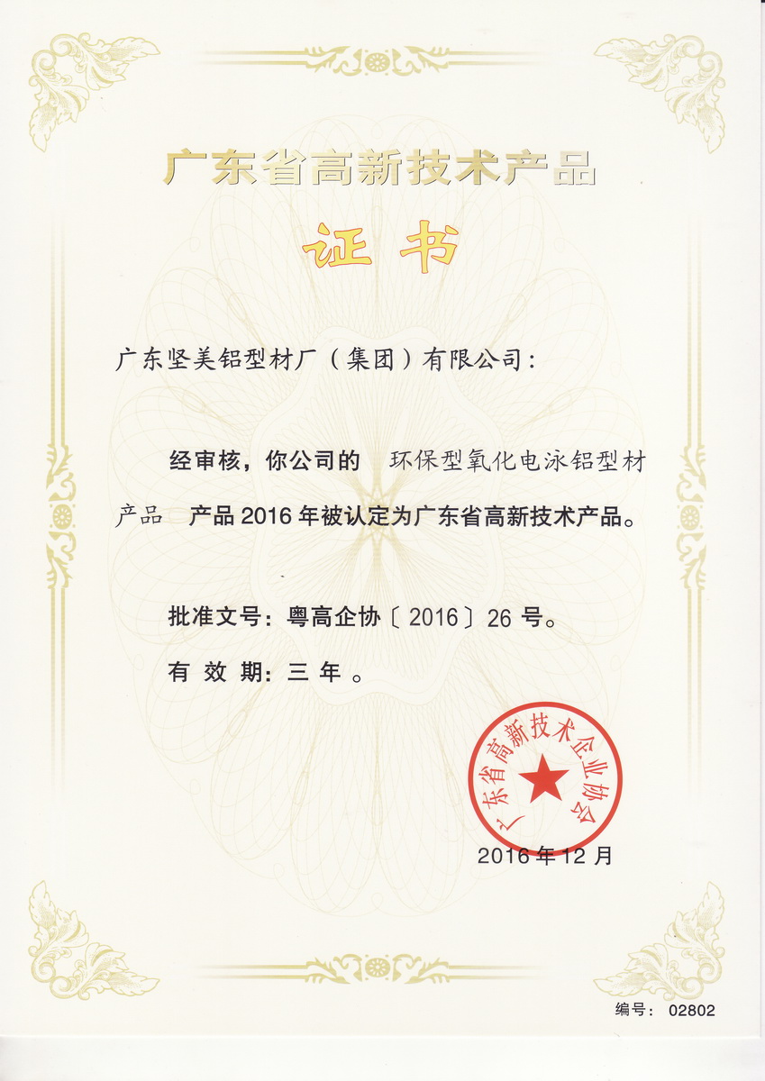 • 2016年12月 2016年度廣東省高新技術(shù)產(chǎn)品證書(shū) :環(huán)保型氧化電泳鋁型材產(chǎn)品(廣東省高新技術(shù)企業(yè)協(xié)會(huì))