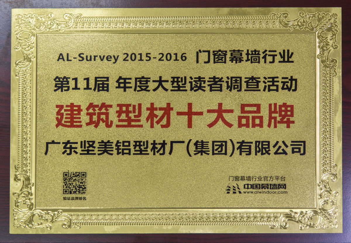 • 2016.3 第十一屆AL-Survey2015-2016門(mén)窗幕墻行業(yè)“第十一屆年度大型讀者調(diào)查評(píng)選活動(dòng)”—建筑型材十大品牌