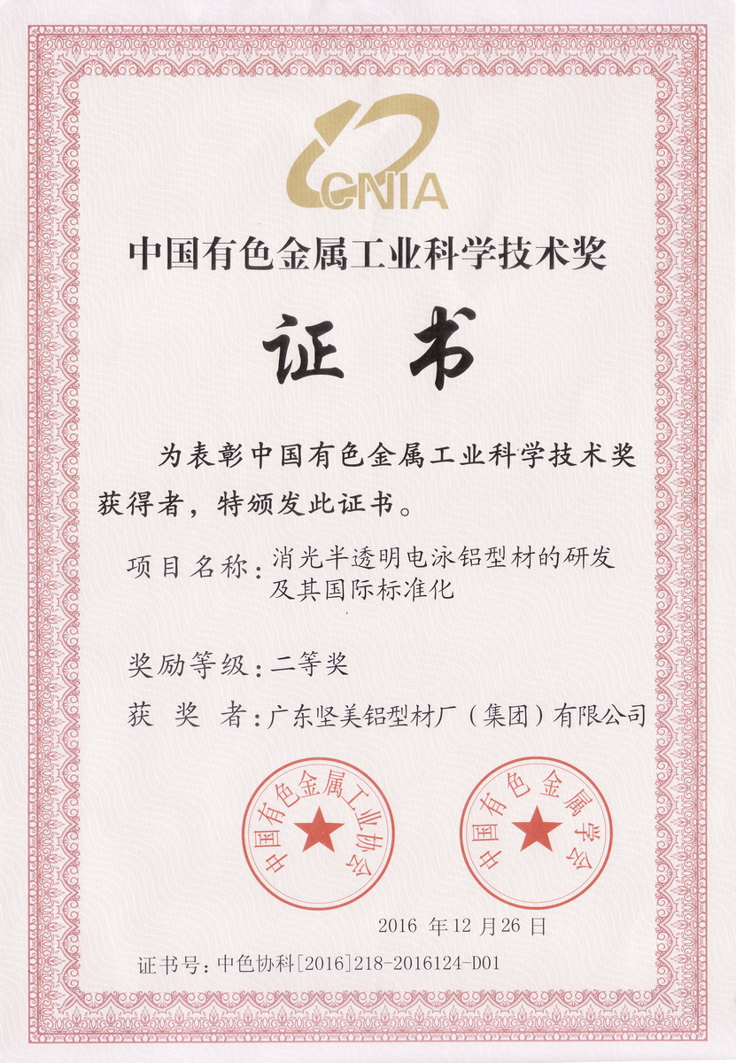 • 2016年12月 2016年度中國(guó)有色金屬工業(yè)科學(xué)技術(shù)獎(jiǎng)二等獎(jiǎng):消光半透明電泳鋁型材的研發(fā)及其國(guó)際標(biāo)準(zhǔn)化(中國(guó)有色金屬工業(yè)協(xié)會(huì))