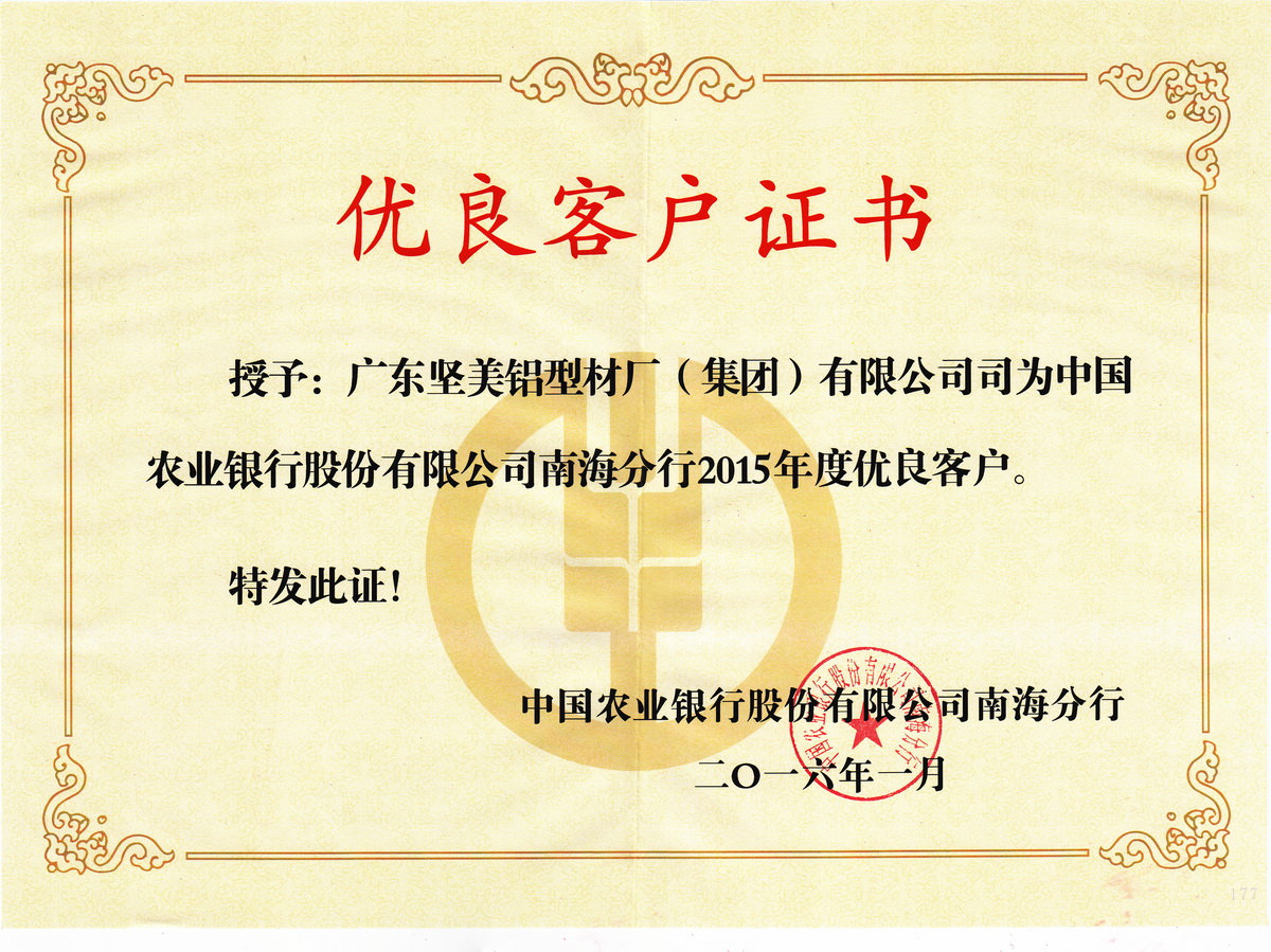 • 2016年1月 2015年度優(yōu)良客戶(hù)證書(shū):廣東堅(jiān)美 (中國(guó)農(nóng)業(yè)銀行南海分行)