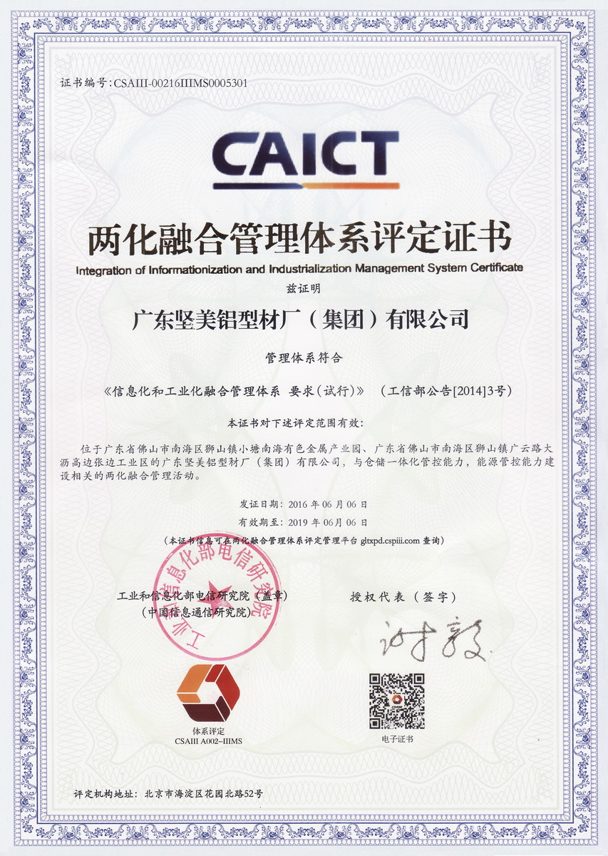 • 2016年6月兩化融合管理體系評(píng)定證書(shū)