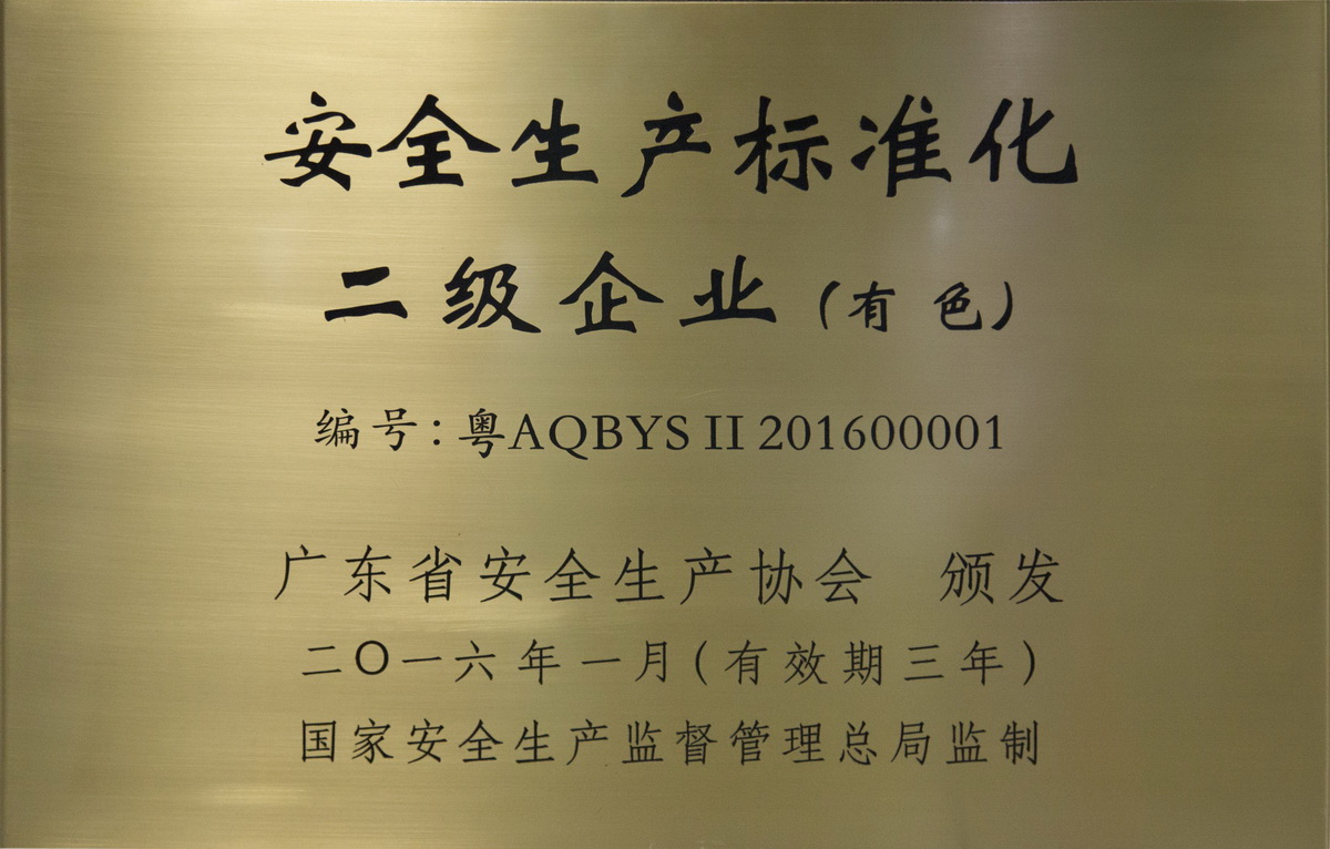 • 2016年1月 安全生產(chǎn)標(biāo)準(zhǔn)化二級(jí)企業(yè)(有色) (廣東省安全生產(chǎn)協(xié)會(huì))
