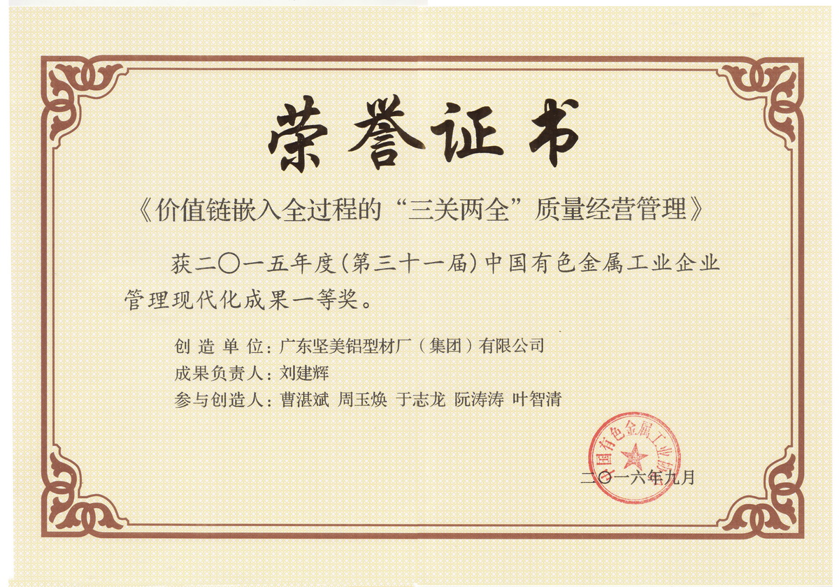 • 2016年9月 2015年度中國(guó)有色金屬工業(yè)企業(yè)管理現(xiàn)代化成果一等獎(jiǎng):價(jià)值鏈嵌入全過(guò)程的“三關(guān)兩全”質(zhì)量經(jīng)營(yíng)管理:廣東堅(jiān)美(中國(guó)有色金屬工業(yè)協(xié)會(huì))