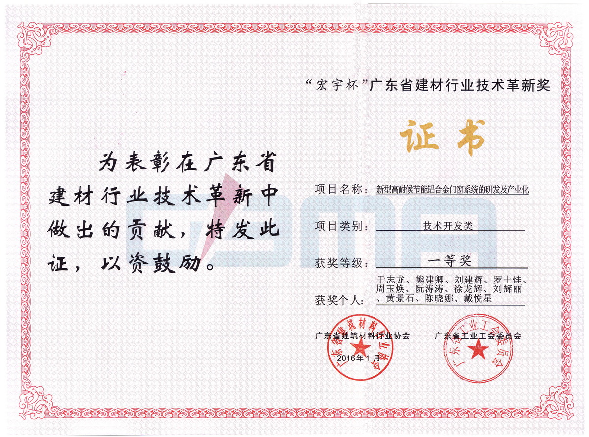 • 2016年1月 廣東省建材行業(yè)技術(shù)革新獎(jiǎng)一等獎(jiǎng):新型高耐候節(jié)能鋁合金門(mén)窗系統(tǒng)的研發(fā)及產(chǎn)業(yè)化:于志龍 (廣東省建筑材料行業(yè)協(xié)會(huì))