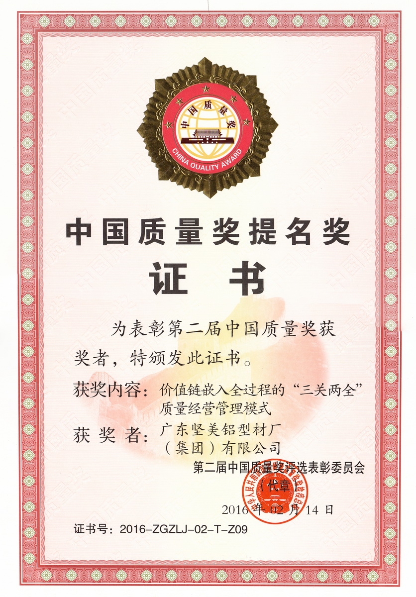 • 2016年堅(jiān)美榮獲第二屆中國(guó)質(zhì)量獎(jiǎng)提名獎(jiǎng)