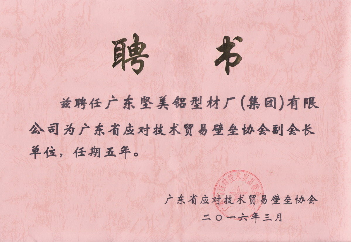 • 2016年3月 廣東省應(yīng)對(duì)技術(shù)貿(mào)易壁壘副會(huì)長(zhǎng)單位:廣東堅(jiān)美 (廣東省應(yīng)對(duì)技術(shù)貿(mào)易壁壘協(xié)會(huì))