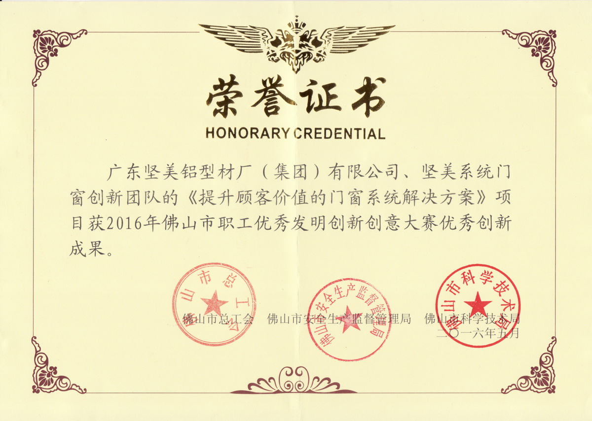 • 2016年5月 佛山市職工優(yōu)秀發(fā)明創(chuàng)新創(chuàng)意大賽優(yōu)秀創(chuàng)新成果:提升顧客價(jià)值的門(mén)窗系統(tǒng)解決方案:廣東堅(jiān)美 (佛山市科學(xué)技術(shù)局)