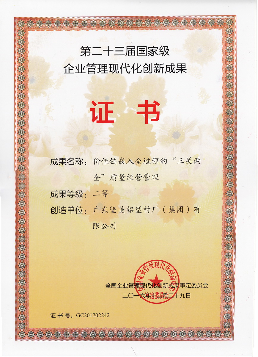 • 2016年12月 第二十三屆國(guó)家級(jí)企業(yè)管理現(xiàn)代化創(chuàng)新成果 二等獎(jiǎng):價(jià)值鏈嵌入全過(guò)程的“三關(guān)兩全”質(zhì)量經(jīng)營(yíng)管理:廣東堅(jiān)美