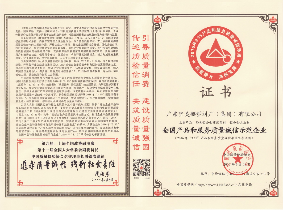 • 2016年3月 全國(guó)產(chǎn)品和服務(wù)質(zhì)量誠(chéng)信示范企業(yè):廣東堅(jiān)美 (中國(guó)質(zhì)量檢驗(yàn)協(xié)會(huì))