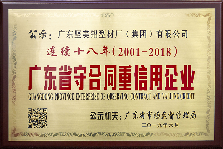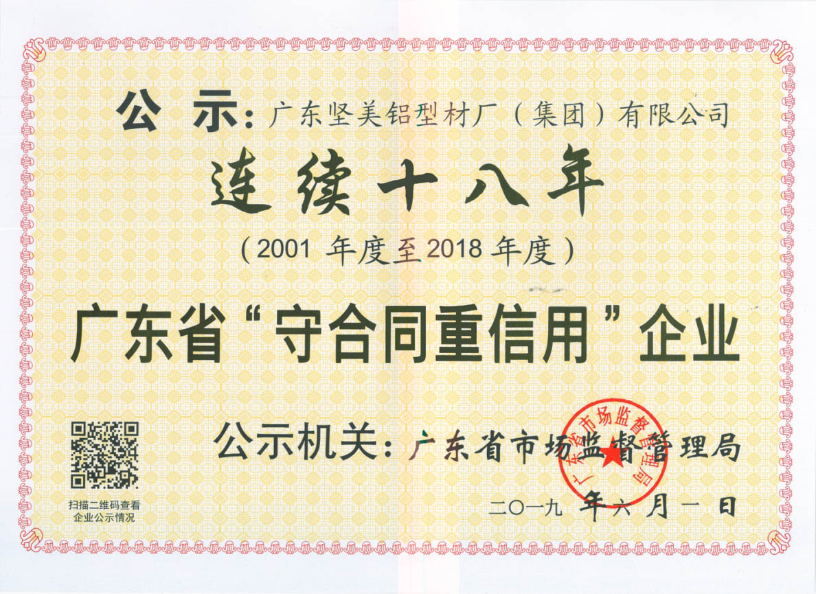 連續(xù)十八年(2001-2018)廣東省守合同重信用企業(yè)